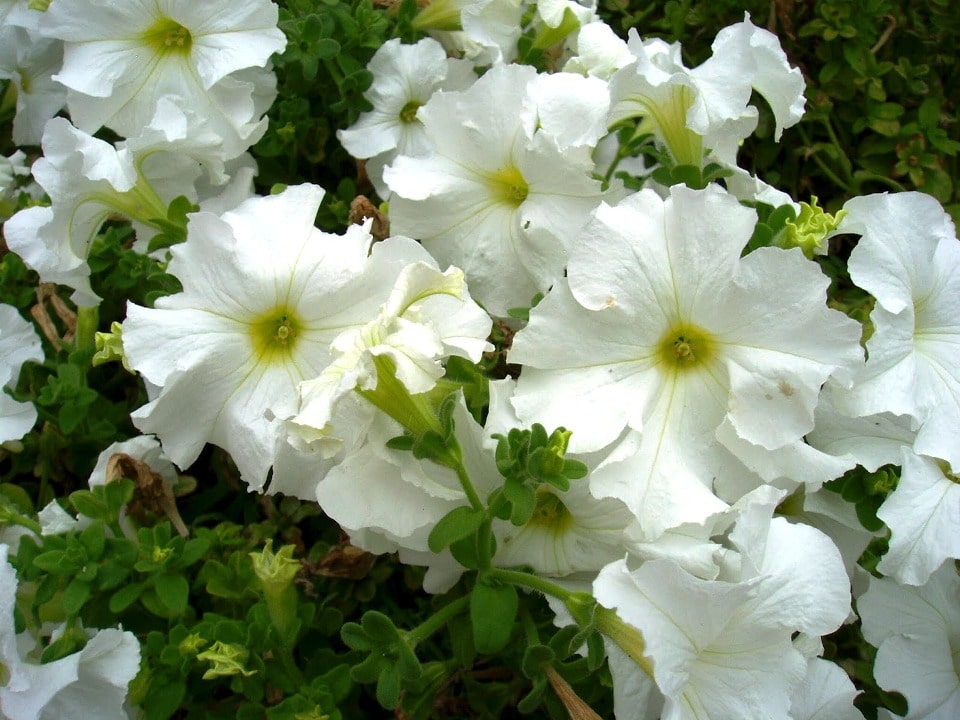 Las petunias blancas, son una variedad de plantas hermosas de la cuales parte la combinación de las flores de esta especie, que resultan como híbridas. Tienen hojas de color verde, tallos de 25 centímetros y flores con forma de trompeta. Su tierno tono de color blanco tienen a inspirar sentimientos de pureza, paz y tranquilidad, en los espacios donde son exhibidas.