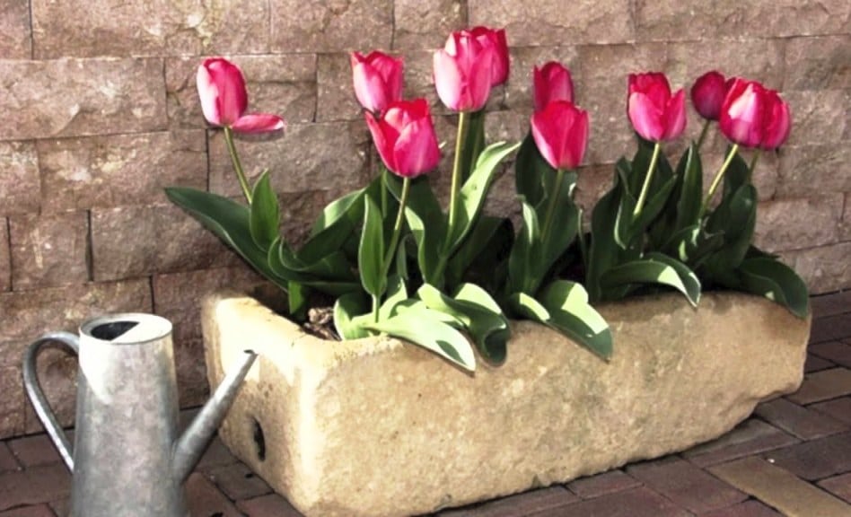 Las macetas, permiten que las plantas de tulipanes se muevan a diferentes espacios, ya sea a patios o balcones, de una forma fácil y en composición de coloridas y atractivas flores. Los bulbos de tulipán que son sembrados dentro de macetas, generalmente necesitan más agua que los bulbos que son cultivados en jardín.