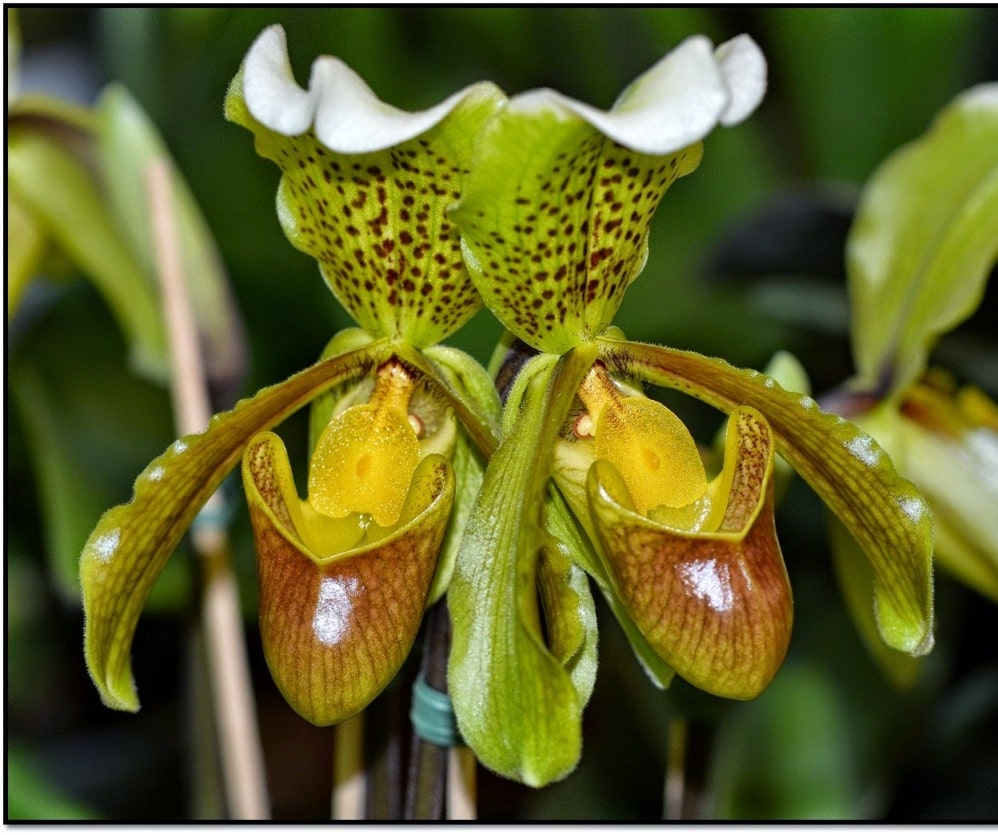 Sus varas florales son relativamente cortas, y al final de las mismas se pueden observar las flores de la orquídea. Las flores de estas clases de orquídeas silvestres son muy llamativas gracias a su labelo en forma de bolsa, combinado con un sépalo grande que en conjunto hacen la forma de una zapatilla. Las flores pueden llegar a medir hasta unos 15 centímetros de longitud.