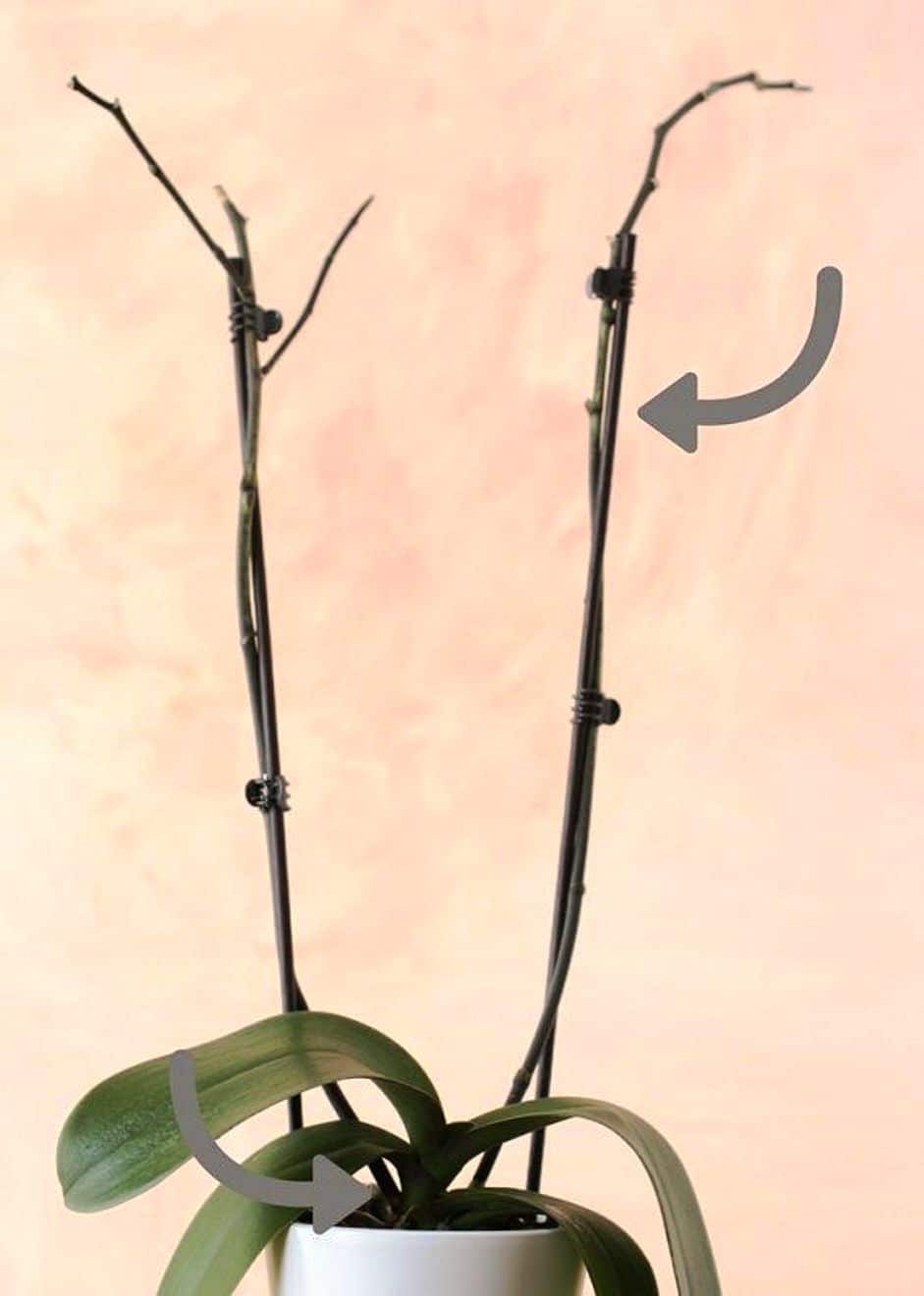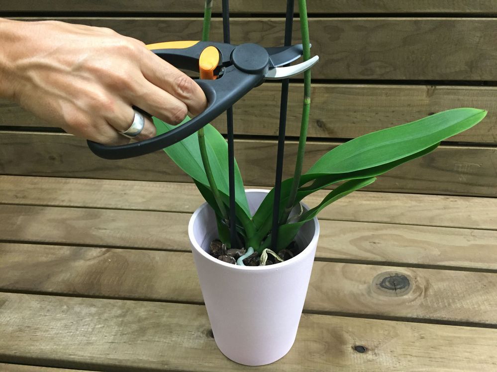 Luego se procede a realizar un proceso de poda a las varas florales de las orquídeas, una vez que a la planta ya se le hayan caído todas sus flores. Dicho procedimiento debe hacerse cortando la vara y dejando solo dos yemas que emanen de la base. No se recomienda cortar por encima de la yema de manera inmediata, sino dejar de distancia unos cuantos centímetros, ya que con esto se evitara que la planta se seque.