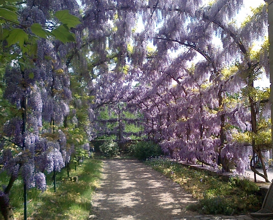 Una glicina Wisteria, engalanando una plaza en una paraje de clima templado.